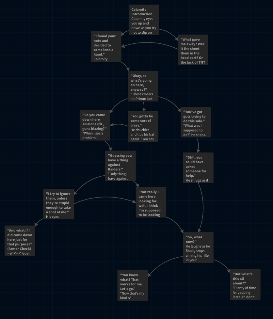Below are two selections of planned Twine scripted interactions. Chapter 0 highlights player monologue/reactions to the changes in reality. Chapter 2 shows the first introduction to player companion NPC “Calamity,” including a potential hostile conversation path.